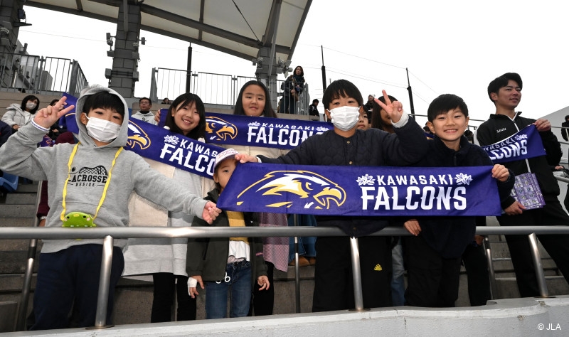 お客さんの声援: 今年始まってからキッズファルコンズを実施しています。小学生やその親御さんが足を運んでくださるので、応援席を見て普段教えている子たちが声かけてくれたのは力強く感じています。